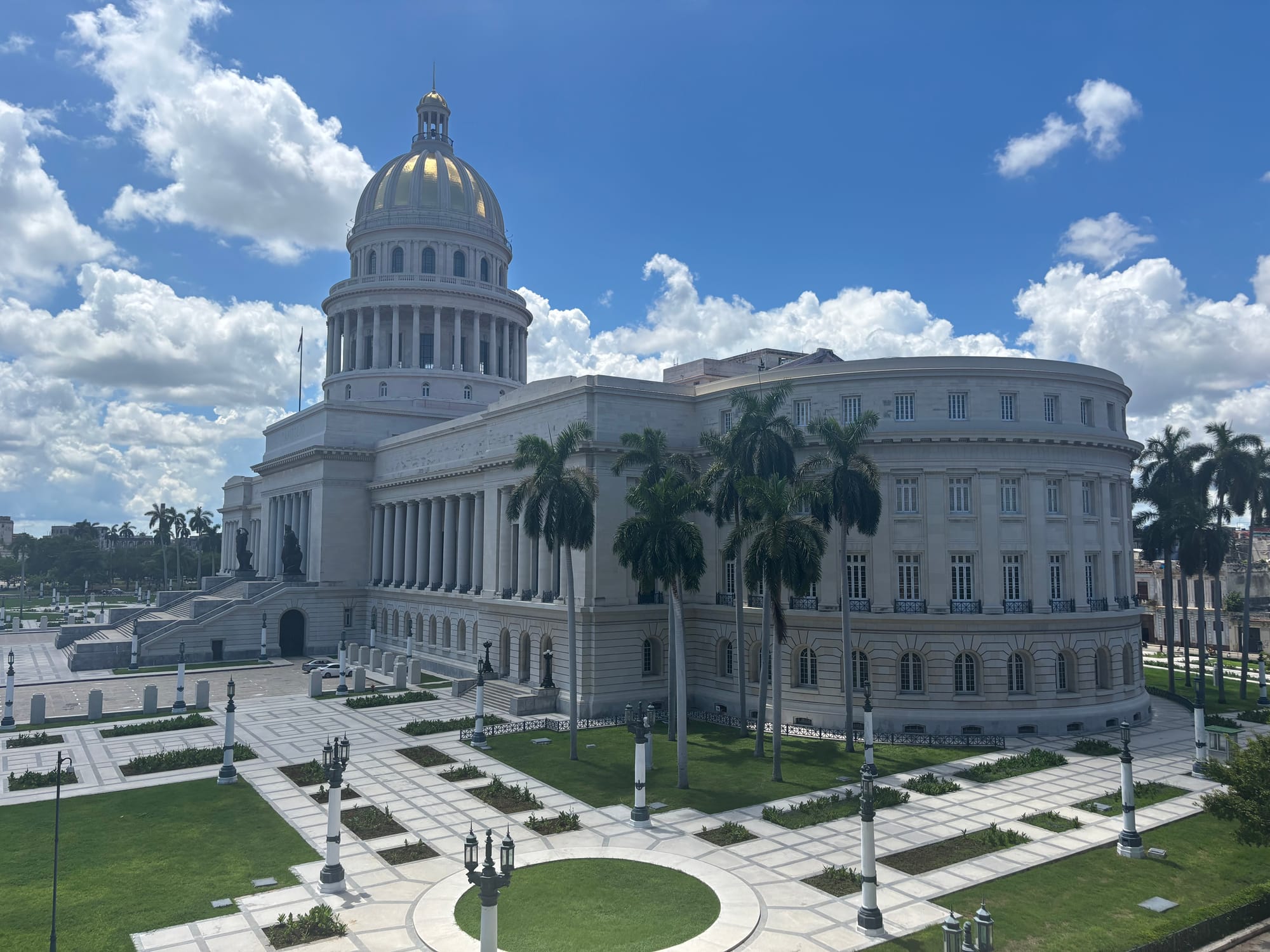 The Capitolio rises in marble imitation of Washington, yet here imitation is already transformation. Its dome gleams in the sunlight, but its edges fray with scaffolding and chipped stone. Grandeur and decay are not opposed but folded into one another.