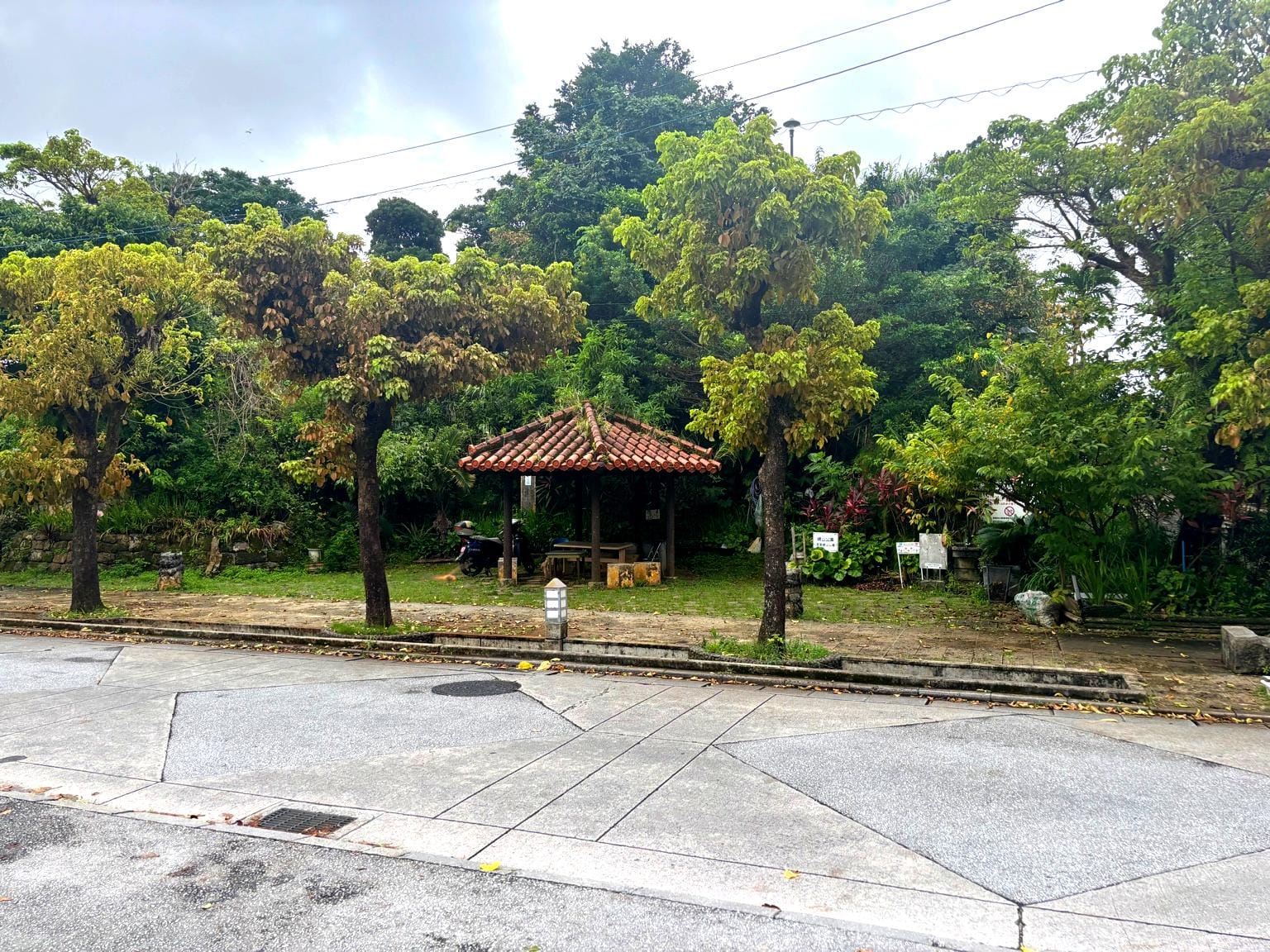 A rest hut, tiled roof, no sign. A man dozing in the heat. A child with a juice box.